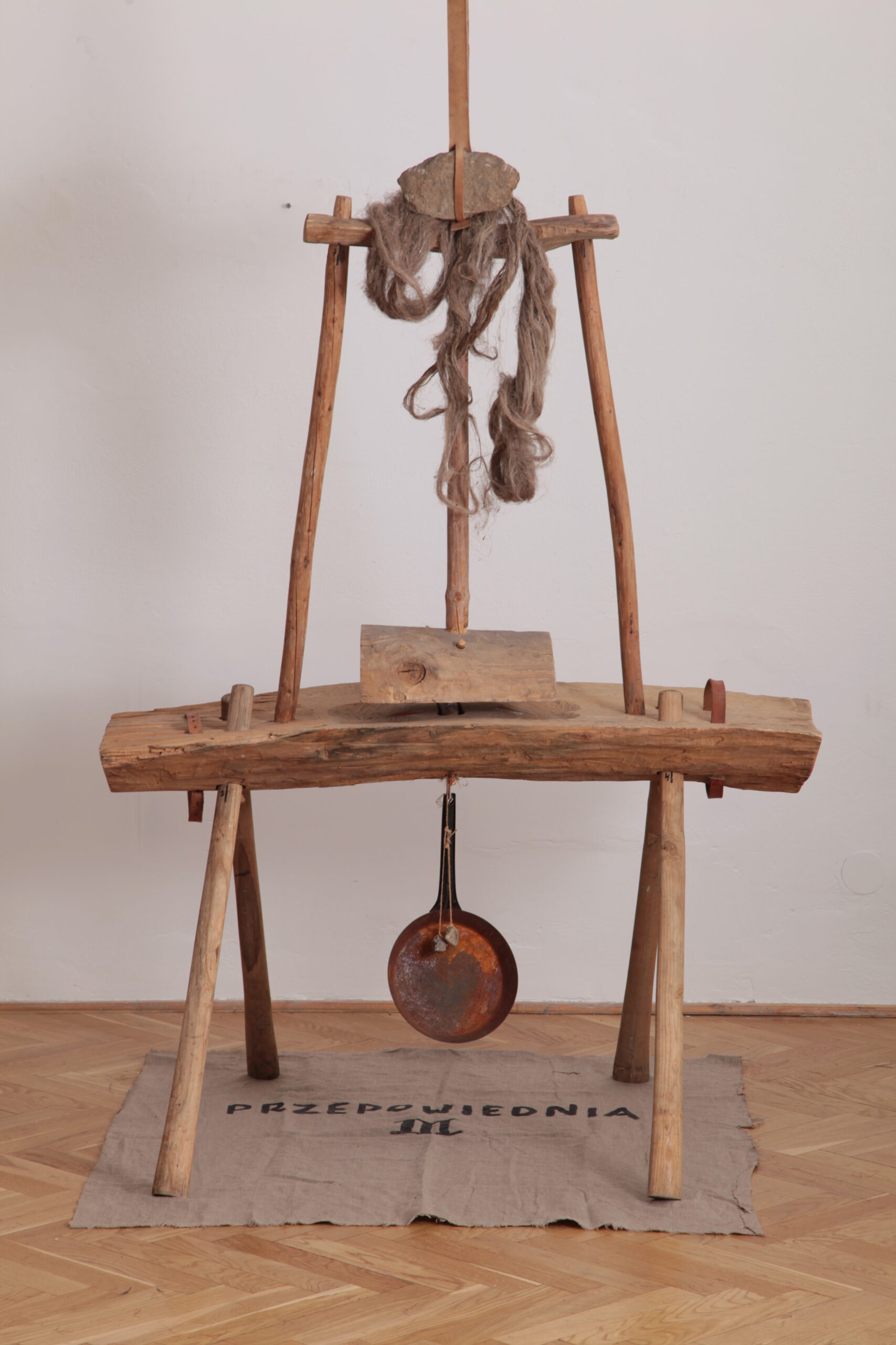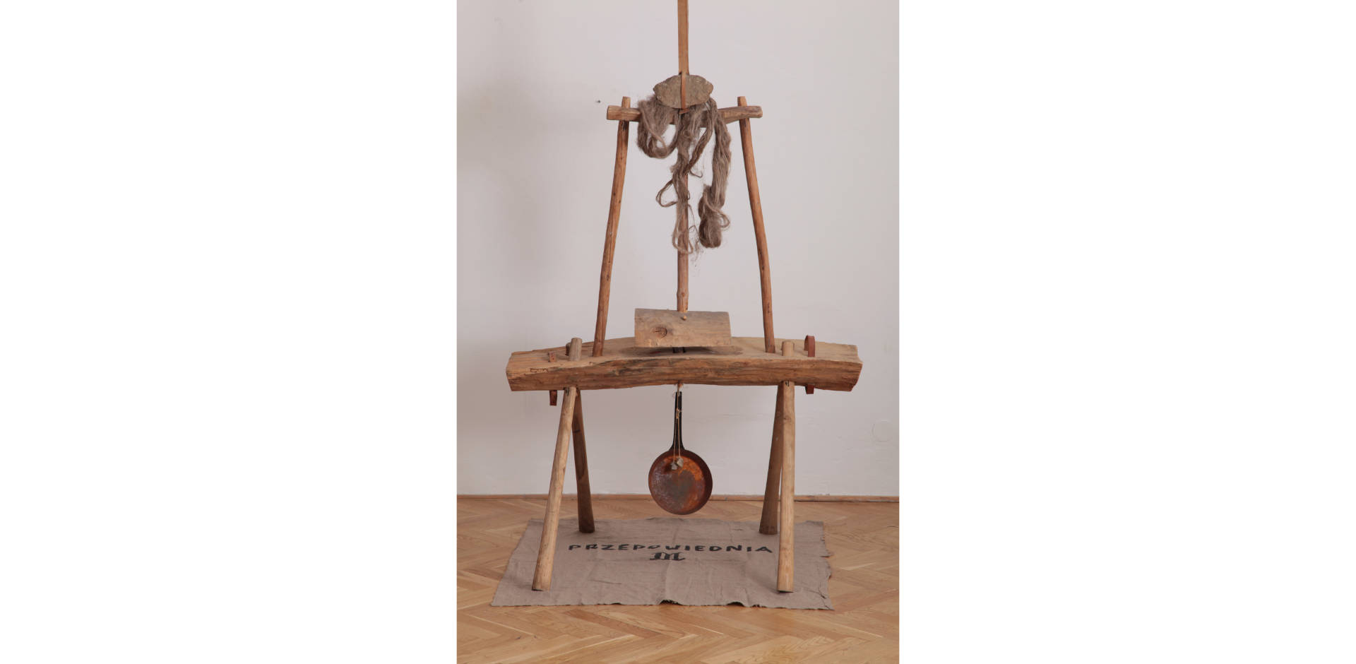 Jerzy Bereś (1930–2012) był uczniem Xawerego Dunikowskiego, rzeźbiarzem, akcjonistą, autorem tekstów. Swoje akcje nazywał „manifestacjami”, a te z kolei łączyły się płynnie z jego twórczością rzeźbiarską. Praca należąca do kolekcji Galerii Studio jest interaktywna: zmianie ulega układ elementów, ukazuje się to, co było niewidoczne. Awangardowy paradygmat łączy się tu z ironią odniesień do politycznej codzienności. Jest sarkastycznym dialogiem z widzem. To przemyślany mechanizm. Wprawienie go w ruch wymaga popchnięcia obciążnika wahadła z czarnym odciskiem dłoni. Wówczas wszystko dzieje się bardzo szybko. Wahadło odchyla się. Odsłania drewnianego fallusa, który ukryty był w zagłębieniu blatu. Osadzony na ośce fallus podnosi się. Widać, że od spodu pomalowany został na biało-czerwono. Równocześnie słyszymy dźwięk uderzających o stalową patelnię kamyków i widzimy duży płaski kamień zawieszony na skórzanym pasku mniej więcej na wysokości naszej twarzy, który pod wpływem odchylającego się wahadła, leci w naszą stronę. Szybki unik. Wahadło zatrzymuje się.